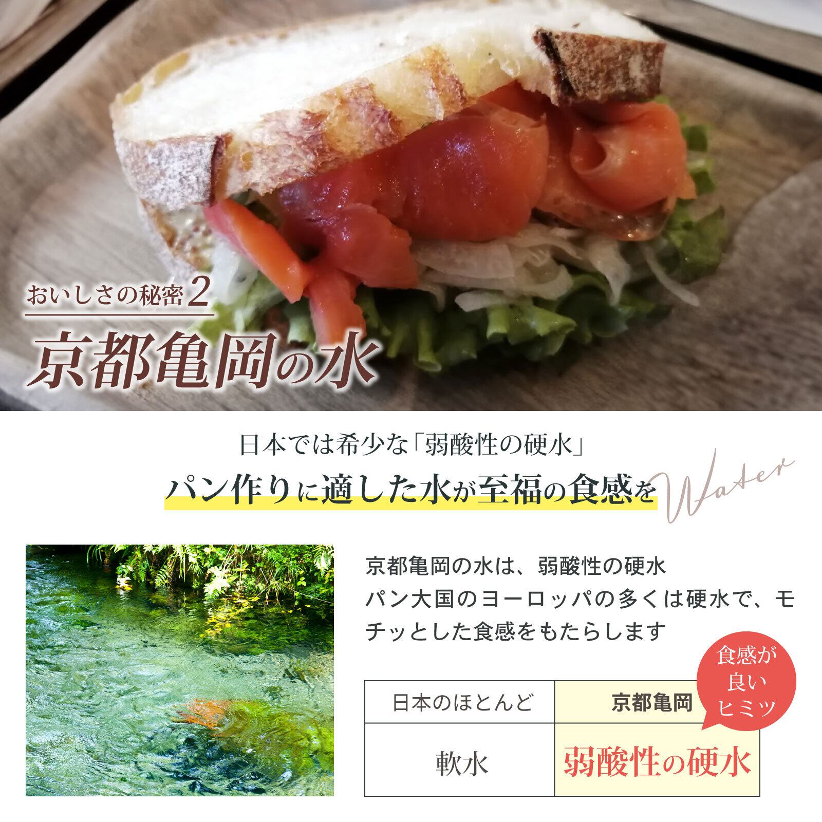 素材にも一切の妥協はありません。北海道産ライ麦全粒粉と国内産小麦粉をベースに、沖縄産上赤糖、こめ油、ヒマラヤ岩塩を使用。そして味の決め手となるのは、地元・京都亀岡が誇る豊かな水(弱酸性硬水)です。この水を使うことで、パン生地がしっかりと引き締まり、豊かな食感と風味が生まれます。